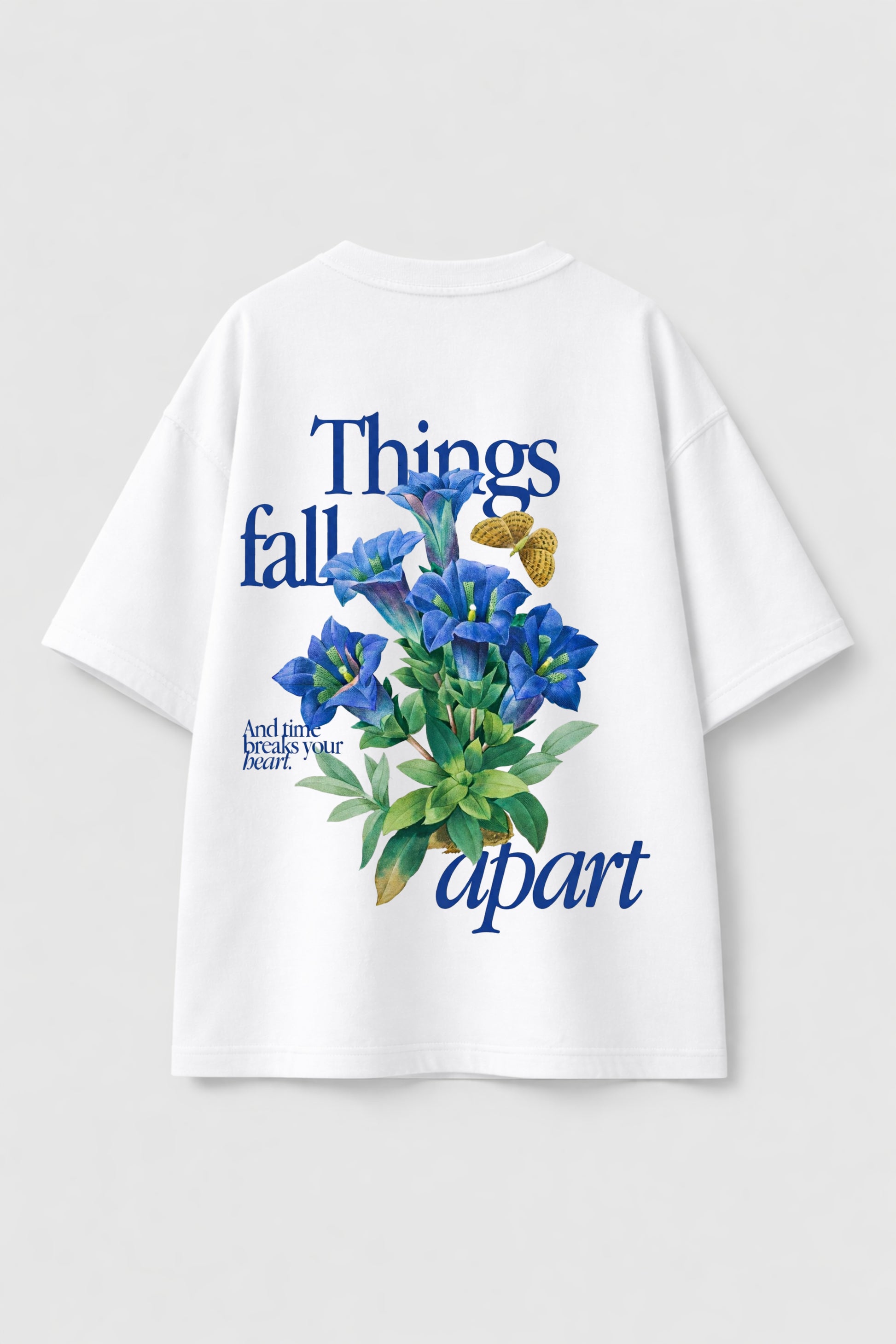 The HABITT — Things Fall Apart Oversized T-Shirt reflects impermanence through quiet contrast. Delicate blue florals bloom across the back, paired with serif typography that reads like a calm admission rather than a declaration. Beauty and fragility exist side by side — intentional, balanced, unresolved.